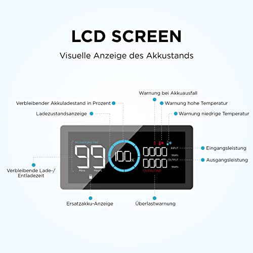- [Einfache Überwachung und Verwaltung] Mit dem gut lesbaren LCD-Bildschirm oder über die EcoFlow App können Sie bequem den Ladezustand einsehen und die Lade- und Entladegeschwindigkeit anpassen.