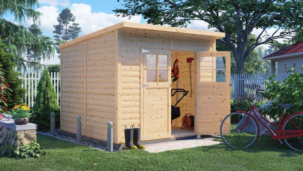 Die Alster-Serie - Gerätehäuser mit modernem Pultdach-Design und schönem Blockhaus-Profil. Vollständige Elementbauweise inklusive Fußboden. Das Dach kann wahlweise nach vorn und hinten geneigt aufgebaut werden.