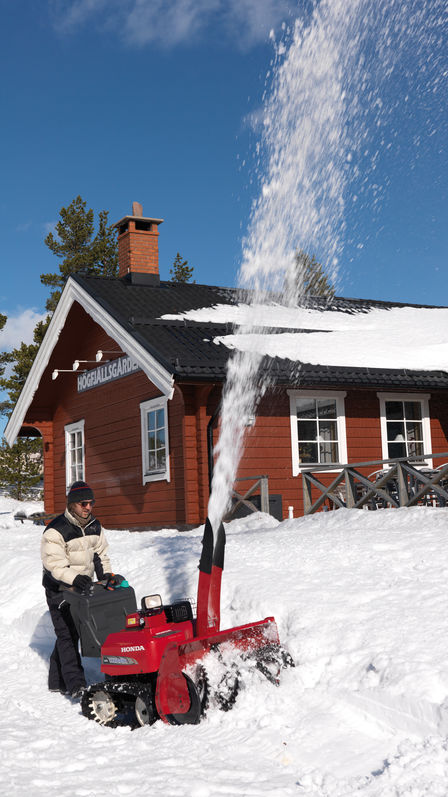 Honda denkt an alles. Die Schneefräse hat einen zweistufigen Auswurf für noch mehr Kontrolle. Sollte der Auswurfkamin jemals mit verdichtetem Schnee verstopft sein, was sehr unwahrscheinlich ist, kannst du ihn ganz einfach säubern. Ein handlicher am Gerät mit Clips befestigter Stab hilft dir dabei, den Auswurfkamin schnell von Eis und Schnee zu befreien.