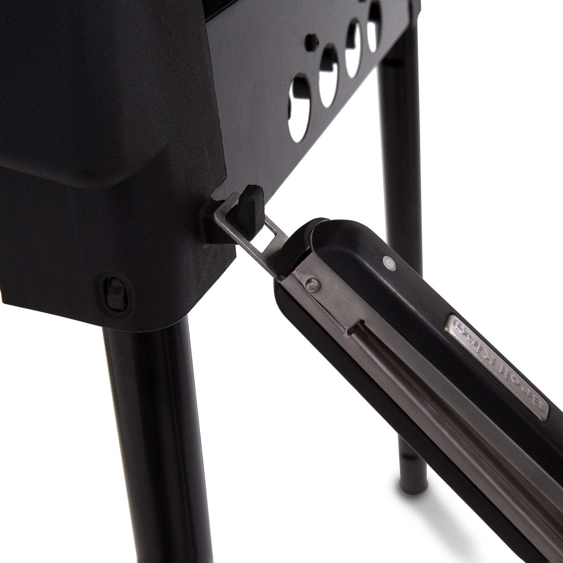 Der Name "Porta-Chef" weist bereits auf seine Tragbarkeit hin. Er verfügt über robuste Seitentische, die als Ablagefläche für Grillutensilien oder Lebensmittel dienen, und lässt sich leicht zusammenklappen, um den Transport und die Lagerung zu erleichtern. Außerdem verfügt er über integrierte Transportrollen.