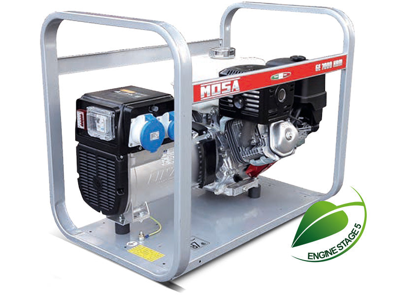 Der tragbarer Benzin Stromerzeuger GE 7000 HBM, HONDA Motor, Reversierstart, luftgekühlt, Rohrrahmen tragbar, 1 Schuko Steckdose 230 Volt, 1 CEE Steckdose 230 Volt 32A, Überlastsicherung, Synchron Generator, Motorschutz Öl, Gewicht 76 kg.
