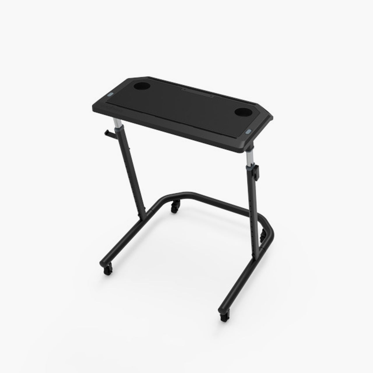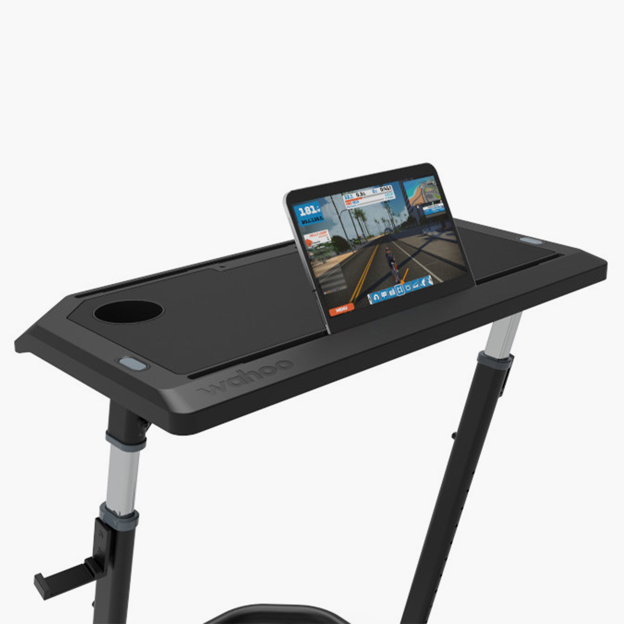 Keep your ride essentials organized and within reach with this indoor cycling desk. Designed for versatility, its adjustable height adapts seamlessly to your setup. New features include handy hooks for towels or gear, recessed holders for bottles or cups, and USB cable organizers—delivering more functionality than ever. With built-in stands for your tech, a slip-resistant surface, and wheels for easy repositioning, this desk is the ultimate upgrade to your Zwift setup.